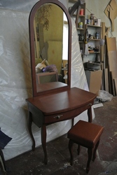 Туалетный столик производится из массива дерева ольхи, бука, ясеня, дуба. В бюро расположен широкий выдвижной ящик, под которым вместительная открытая полка. Размеры изделия в стандартном исполнении 800х500х1900 мм.