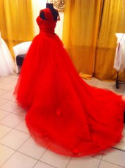 Продам шикарное красное свадебное платье. С сьемной юбкой, шлейф 800 м, нашитые лепестки. Без сьемной юбки, смотрится, как вечернее. 92-65-90 Рост 175 и каблук был 7 см. Фата есть.