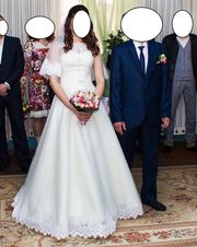 Шикарное платье цвета айвори со шлейфом Подойдет на размер 42-44 На рост 170 и выше Рисунок кружев современный с добавлением бусинок Гибкий, хорошо поддерживающий корсет на змейке, шнуровке и пуговичках Низ платья красиво расшит Платье НЕ ВЕНЧАННОЕ!!!! Фата подбиралась индивидуально под платье, одинаковая вышивка Накидка-болеро в цвет платья с длинным рукавом и воротником стоечкой Низ платья нуждается в легкой химчитке, на фате осталась малюсинькая дырочка от шпильки В подарок кольца (делают пышный низ), украшение на машину, маленькие шарики для украшения машины, ползунки (для конкурса), подушка под кольца Возможна примерка в Харькове Пересылаю новой почтой Цена 3000гр.