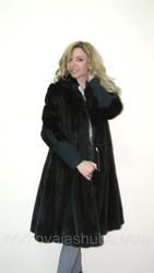 Фирменная норковая шуба орехового цвета с затемненными спинками норки. Данная модель может подойти на размеры: 46-48-50. Модель «халат», приталивается меховым поясом. Рукава вшивные широкие, прямые, с манжетами из поперечных пластин меха.
