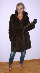 Шикарный полушубок из канадской норки под поясок с воротником стойка размер 44 46 48. Цвет норки - темно коричневая, темный шоколад. Полушубок застегивается на стразу под горло, а также с помощью дополнительных крытых крючков.