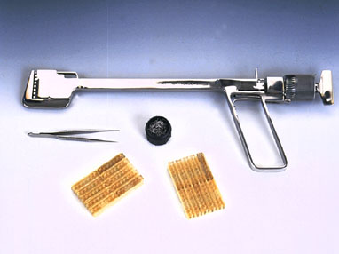 Предназначен для ушивания кровеносных сосудов при хирургических операциях на сердце, легких и органах брюшной полости путем создания герметичной культи при пересечении сосуда. Принцип действия заключается в том, что ушивемый орган располагается между рабочими частями аппарата, сдавливается до зазора прошивания и прокалывается металлическими скобками, ножки которых, попадая в лунки матрицы на упорном корпусе, загибаются в виде буквы В. Образуется герметичный шахматный шов длиной 28 мм. |