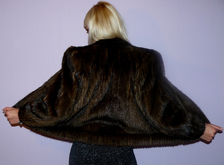 норковая шуба автоледи из кусочков вязанная коричневого цвета. фирма Furs by Clyde размер S от 42 до 46. состояние хорошее. рукава снизу на резинке, если присмотреться и растянуть резинку - есть потертости, но если не растегивать резинку - ничего нет. подкладка в идеальном состоянии. цвет темно коричневый, немного светлее чем на фото. есть два кармана боковых, шубка демисезонная. параметры: застегивается под горло на три скрытых крючка, воротник - стойка, длинна по спине - 63см, длинна рукава - 63см, есть подплечники, модель прямая. |