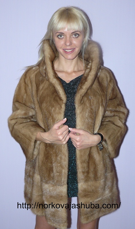 норковая шуба, полушубок с красивым широким воротником, двойная подкладка, очень теплая, внизу - широкая поперечка. размер М - L 48 - 50 -52. длинна шубки по спине - 84см, длинна рукава - 48см, рукав - реглан. шуба застегивается на два скрытых крючка. высота поперечки - 23см. |