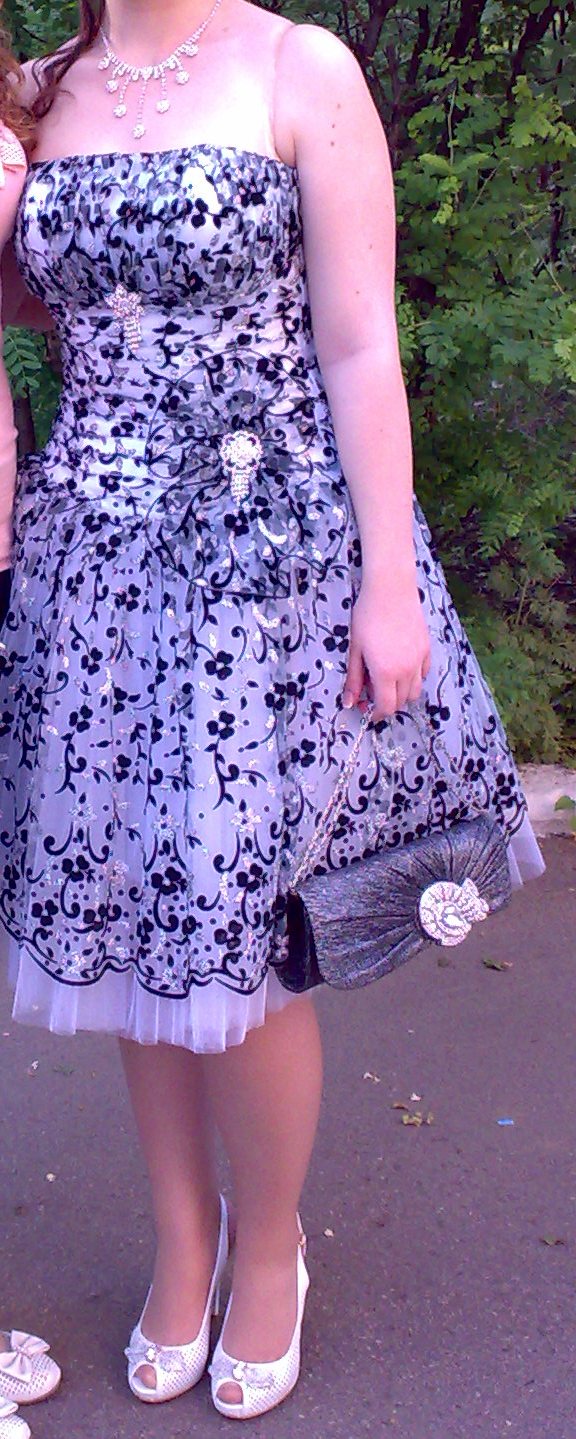 Общая высота около 80см, юбка – около 45см. Спина: молния + шнуровка для регулировки. Черный рисунок из бархата, а все светлое - расшито серебряной нитью. Надевалось всего 1 раз на выпускной. В отличном состоянии! |