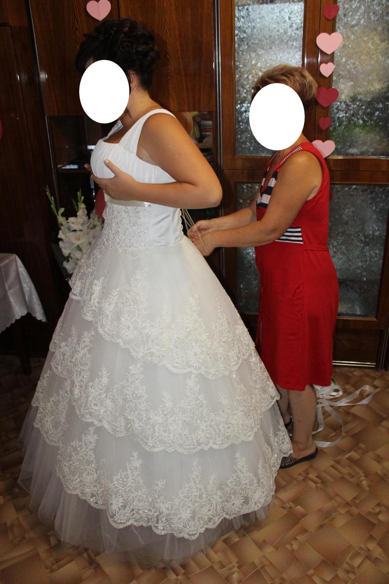 Продам свадебное платье, не венчанное, для пышных форм невесты, большая грудь, цвет айвори, А - силуэт, отлично подчеркивает талию, держит грудь на широких бретелях, что позволяет поддеть бюстик, не создает дискомфорта. Юбка ручной работы, вышита бисером и стразами. На рост 1.75 + каблук мне было даже длинновато. В комплекте подюбник (кольца) для пышности, перчатки. |