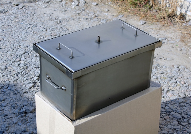 Принцип действия: на дно коптильни насыпаем опилки (под поддон), выкладываем на решетку продукт, накрываем крышкой. Ставим коптильню на открытый огонь (главное ровно) и заливаем по периметру крышки воду (так называемый гидро-замок). На крышке наварен штуцер (на него можно надевать трубку и выводить в окно или вытяжку, что б использовать в домашних условиях) - это единственный путь поступления кислорода в коптильню. Как только из него начинает идти дым, надо засекать время - процесс пошел!!!!!!