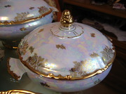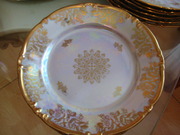 Продам фарфоровый сервиз (столовый и чайный) на 12 персон, Германия, 50-е, 88 предметов. Производство фабрики Roschützer Porzellanfabrik Unger Schilde, г. Рошюц. Годы использования клейма с 1896 до 1968. Вся посуда золоченая, цировка. Все предметы в наличии, целые, реставрации или склейке не подвергались. |