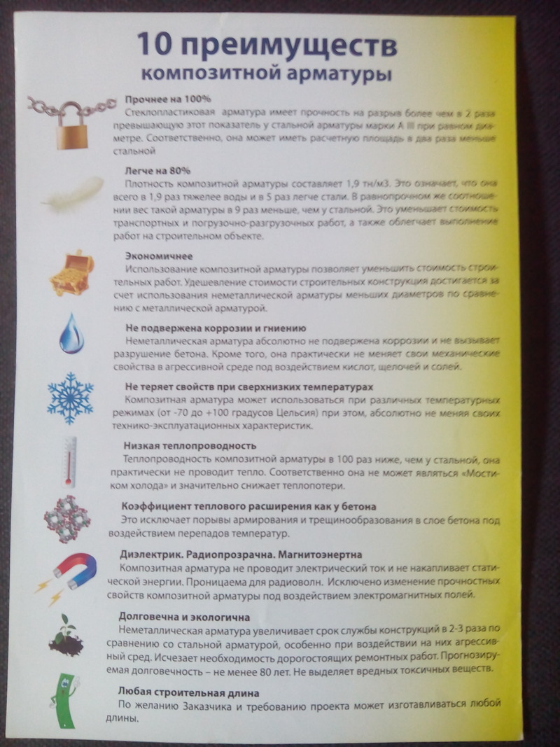 Арматура - материал, без которого не обойтись в современном строительстве. Развитие науки и технологий не стоит на месте, и уже давно придумана замена классической стальной арматуре - арматура композитная. В Европе и во всем мире её давно используют в сооружениях с повышенной вибрацией: мосты, АЭС, ГЭС, а также при создании армопоясов в регионах с повышенной сейсмоактивностью. Также применяют в специальных учреждениях, медицинских и исследовательских центрах, т.к. композитная арматура - магнитоэнертна, т.е. не влияет на аппаратуру. Срок службы полимерной арматуры больше в несколько раз, она не подвержена ржавчине, стойкая к агрессивной среде. Выбор в пользу композитной арматуры - это правильное решение,потому что, она практична и удобна в применении, вес 100м бухты менее 10 кг, что позволяет транспортировать даже легковым автомобилем, и не смотря на это, она в несколько раз прочнее стальной. Важно и то, что она безопасна для человека, т.к. не выделяет вредных токсичных веществ.