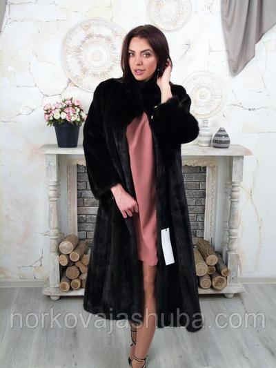 Длинная норковая шуба красивого темно-коричневого окраса, разновидность канадской норки dark brown. Посадка шубки свободная, на фигуре смотрится аккуратно и элегантно за счет зауженной линии плеча и вытянутой проймы. Воротник невысокая стойка, можно носить как отложной. Рукава широкие, длина 7/8, снизу ширину рукава можно регулировать вшитой кулисой. Длина шубки 122 см. Подходит на размер 52 54 56.