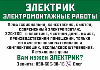 Электрик, Электромонтажные работы - профессионально,качественно,,быстро! Комплекс электромонтажных работ в квартирах,частных домах,офисах,производственных помещениях.Работа с качественными материалами! Актуальные цены! |